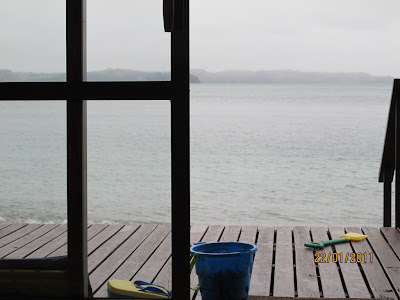 We left on a beautiful sunny summers day to the most wonderful little bach really close to the water. For that afternoon we got to taste what this holiday would be like with the kids all swimming and playing in the sand and walking over the rocks while we sat back and relaxed with a glass of wine and a dip in the bath-hot still waters of Scandrett Regional Park. However by the next morning the skies had become overcast and by that afternoon it started to drizzle. George came to the rescue by taking the kids back to his beachouse for a swim in the pool and then keeping the big boys to take them fishing on his boat the next day. As the bach was so small it would have been terrible having all 4 kids and us cooped up and unable to go outside. By Saturday the weather was looking even worse and pretty much set in so we went to the Matakana Farmers Market then I took the 2 little kids to see the Yogi Bear Movie. That afternoon the little ones looked after themselves and kept themselves occupied watching Snow White on the portable DVD player (a last minute addition to the packed gear), and making a hut in their room. By Sunday cyclonic winds and a huge high tide hit and we decided then and there to abandon ship and go to George and Russell's beachouse where we had been planning to go for a couple of nights on Monday. I could not believe how disasterous this holiday had become. Luckily the weather improved a bit and by Monday afternoon it had stopped raining and the wind eventually died down and by Wednesday, (the day we were leaving), it dawned a brilliant sunny day.